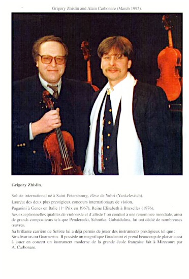 Le mercredi 17 mai 1995, à MOSCOU, Grégory Zhislin interprétait en solo une création dédicacée spécialement pour lui par Christophe Pendericki sur un instrument fabriqué par Alain Carbonare. Le succès de cette création a réuni les trois hommes et ce trio d'enfer porte la lutherie de Mirecourt en première place dans le monde.